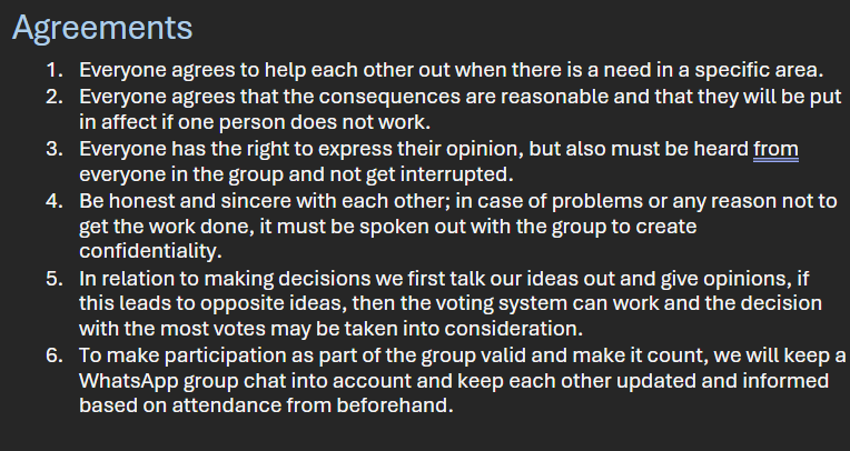 First we get to know each team member to have a starting view on how things will move. Set rules, agreements and core values that we have to follow and that all of us agree upon.